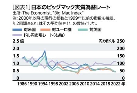 たとえば、ビッグマックの価格でみると、2000年4月には米国より2割程度高かったが、2023年1月には4割程度安くなった。また、OECDの購買力平価(PPP)レートから計算すると、1995年には米国の2倍近かった日本の物価は、2022年には米国よりも3割程度安くなった。