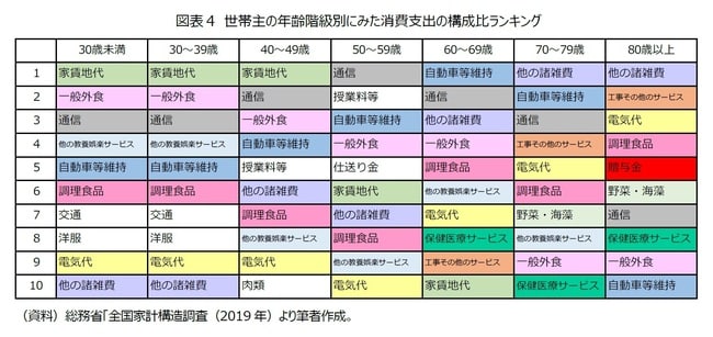 ここで、普段の高齢者の消費生活の特徴を見るために、総務省「全国家計構造調査(2019年)」から、世帯主の年齢階級別に、全消費支出に占める支出割合が大きい上位10項目を、筆者がランキングしたもの(図表4)を参照する。