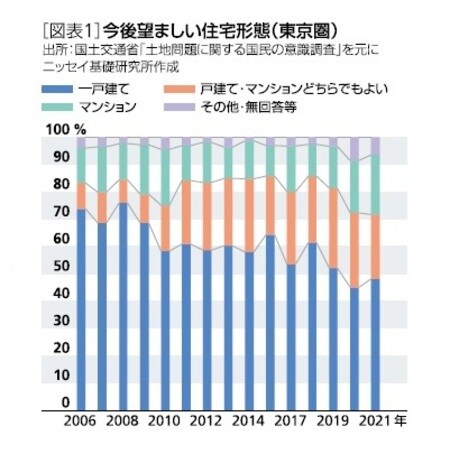 国土交通省「土地問題に関する国民の意識調査」によれば、東京圏在住者を対象に「今後望ましい住宅形態」を質問したところ、一貫して「一戸建て」が最も多く、次いで「戸建て・マンションどちらでもよい」、「マンション」の順となっている[図表1]。