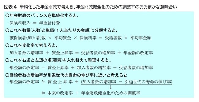 このうち、賃金上昇率が本来の年金改定率であり、加える部分が年金財政健全化のための調整率(マクロ経済スライドのスライド調整率)に相当する。加入者数の増加率は少子化の影響で基本的にマイナスになるので、年金財政健全化のための調整率(マクロ経済スライドのスライド調整率)は基本的にマイナスになる5。