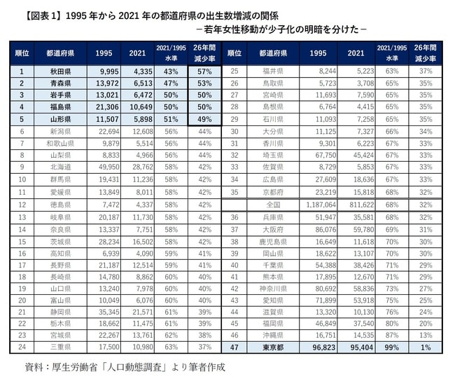 半世紀で見ても、もともと出生減割合でワースト上位に位置していた東北地方だが、東京都にアクセスのよい立地と交通利便性の上昇が影響し、東北エリアから大量の就職期の若年女性が東京都に転入超過している。将来の母親候補となる若年女性人口減が生じた結果、東北エリアの5県がこの四半世紀における少子化ワースト5の上位を独占する、という状況に陥っている。