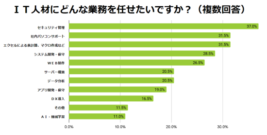 次に多かったのは「社内パソコンサポート」と「エクセルによる表計算やマクロ(簡易プログラム)の生成」との回答で、それぞれ31.5%だった。現在は世代間などで社内のITスキルの格差が大きいことから、高度技術だけではなく、基本的な能力を持つ人材を喫緊で必要とする企業も多いようだ。