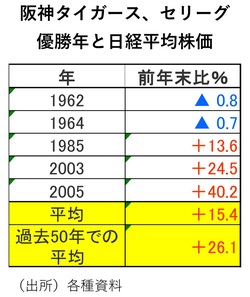 ~過去50年間で阪神は3回セ・リーグ優勝。優勝年の日経平均株価は前年比が2ケタ上昇