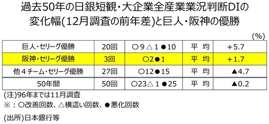 1973年以降2022年までの50年間での日銀短観・大企業・全産業12月調査の前年差変化幅の平均は▲0.2ポイントです。人気球団の巨人の優勝年では改善・悪化が概ね半々ですが、前年差変化幅の平均は+5.7ポイントの改善です。人気2位の阪神の優勝年では改善が2回・悪化が1回ですが、前年差変化幅の平均は+1.7ポイントと改善です。残る4球団(ヤクルト・広島・中日・DeNA)の優勝年では改善が12回・悪化が15回ですが、平均は▲4.7ポイントの悪化になります。