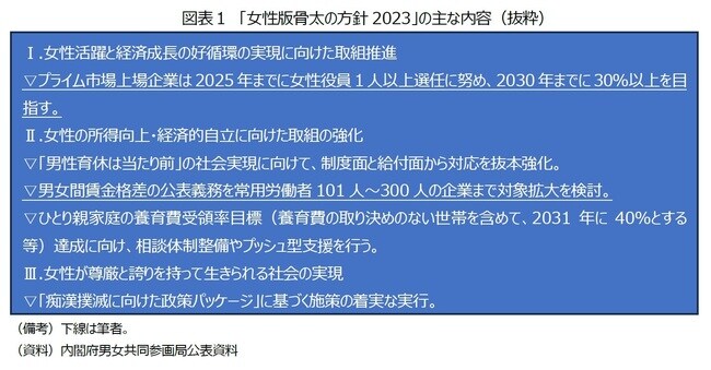 しかしもう一つ、今年の女性版骨太の方針の中で、筆者が注目している項目がある。働く人の男女間賃金格差について、公表を義務付ける対象企業の拡大を検討するとしたことだ(図表1)。
