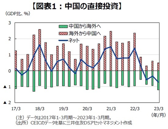 ●国際収支統計を見ると、海外から中国への直接投資は縮小傾向にある一方、中国から海外への直接投資は拡大傾向にあります(図表1)。後者の中には外国企業の中国からの規模縮小・撤退も含まれます。