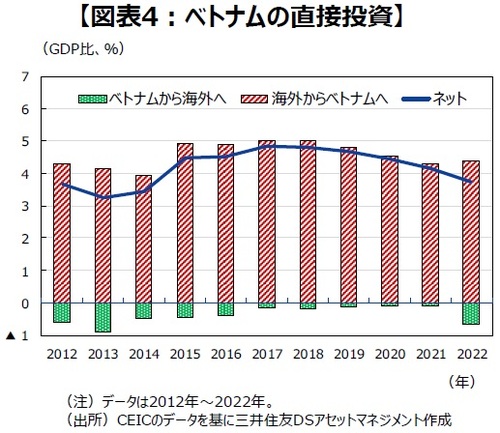 ●その代表例がベトナムです。海外からベトナムへの直接投資のGDP比は2022年で3.7%と、ここ数年間でやや低下傾向にあるとはいえ、高い水準を維持しています(図表4)。ベトナムは人件費が安い上に、貿易協定を通じた輸出環境の整備を行いやすい点を指摘できます。前述の図表2の通り、ベトナムは、環太平洋パートナーシップに関する包括的および先進的な協定(CPTPP)、地域的な包括的経済連携協定(RCEP)、インド太平洋経済枠組み(IPEF)の3つの経済協定に加盟しています。また、中国が依然として世界のサプライチェーンの中心的な役割を果たしているという現状を鑑みれば、中国と近接しているという地理的な利点もあります。米中対立が長期化する様相を呈している状況下、ベトナムへの直接投資が再び加速する可能性があります。