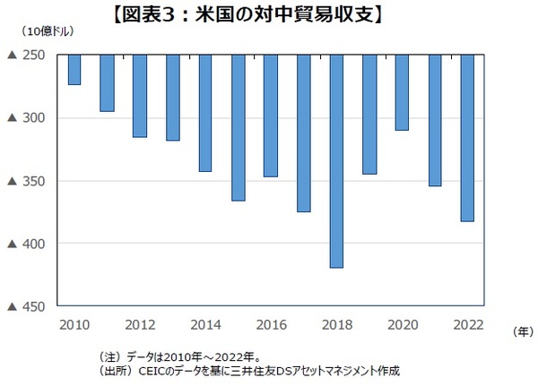 ●一方、現実的な問題を考えると、中国が世界のサプライチェーンの中心的な役割を占めているという事実から目を背けることはできません。米国の貿易統計を見ると、中国に対する貿易赤字は2020年以降、拡大傾向にあります(図表3)。米国経済にとって、中国経済は必要不可欠な存在になっていることから、中国を世界のサプライチェーンから完全に切り離すことは現実的ではありません。
