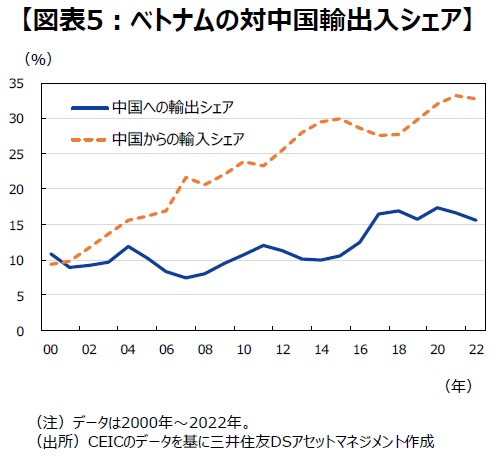 ●中国が世界のサプライチェーンの中心にあるという現実はすぐには変わらないため、外国企業がベトナムに積極的に進出するにしても、中国経済との関与は何らかの形で続くでしょう。実際、ベトナムの輸入に占める中国シェアは上昇傾向にあります(図表5)。