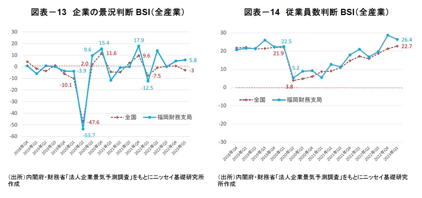 内閣府・財務省「法人企業景気予測調査」によれば、「企業の景況判断BSI3」(福岡財務支局)は、コロナ禍が発生して2020年第2四半期に「▲53.7」と一気に悪化した。その後は、回復と悪化を繰り返しながら、2023 年第1四半期に「+5.8」まで回復した(図表-13)。