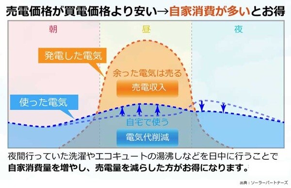 そのため、太陽光発電による売電価格よりも夜間等に東京電力から買電している電力単価の方がはるかに高額です。つまり電気代の支出を抑える、もしくは太陽光発電の収益性を高めるのならば、太陽光発電による電気をより自宅で消費し、なるべく電力会社からの買電を減らした方が得ということになります。これを「自家消費率の向上」といいます。太陽光発電を載せるのならば、この「自家消費率の向上」がポイントになります。