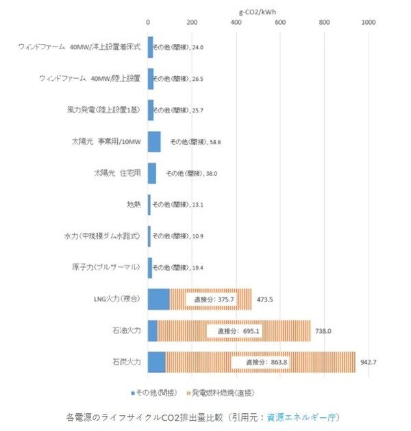 【図表4】に示すように他の発電方式と比べても、建設時等の「間接」と発電燃料燃焼の「直接」とも、住宅用太陽光のCO2排出量は非常に少なくなっています。