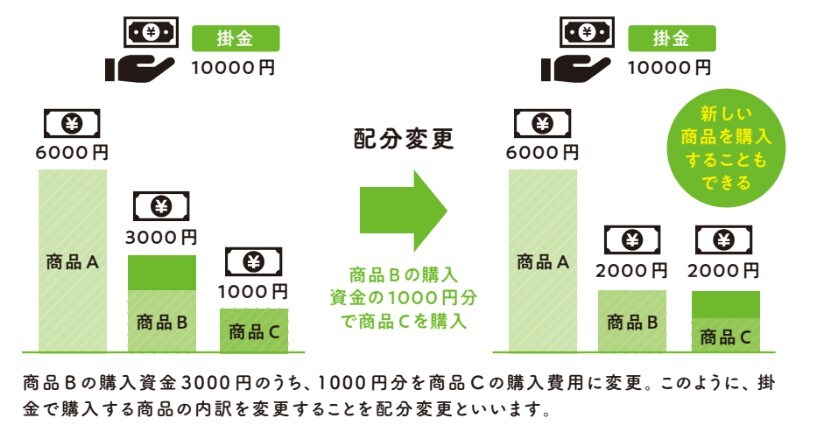 配分変更というのは掛金で購入する商品の内訳を変えること。例えば、保有している「商品A」の掛金を減らして、その分「商品B」の掛金を増やすといったことだね。