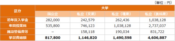 国公立、私立別に見た大学の年間の学習費総額は下の表のようになっています。大学も、国公立の方が私立より安くなっています。国公立の場合、施設整備費は一部の学部を除いてほとんどかかりません。また私立の場合は、文系、理系、医科系のどこに進むかでもかかる費用は大きく変わってきます。