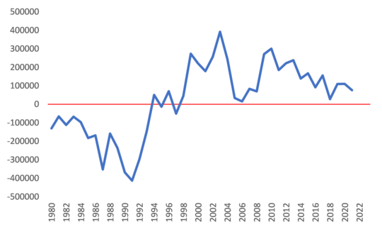 まずは、企業の資金余剰がいかに日本の低成長の象徴であり、原因であったかを視覚的に確認しておこう。図表1は日銀の資金循環表のデータから作成した企業の資金過不足である。
