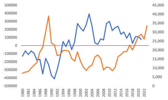 記事では、「その企業がようやくおカネを設備投資に回し始めた」ということを述べたところ、今週月曜日(2023/6/26)のモーニングサテライト「プロの眼」で、ニッセイ基礎研究所の矢嶋さんが僕とまったく同じことを話しているのを聞いてびっくりした。まさに以心伝心とはこのことだ。矢嶋さんは、この資金フローの変化の背景として、3つの経済主体(企業、家計、政府)のベクトルが合致したから、ということを挙げておられたが、まさにそのとおりである。