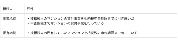 被相続人が賃貸していたマンション住戸を、親族が相続した場合は次の条件全てに合致していなければいけません。下表をご覧ください。