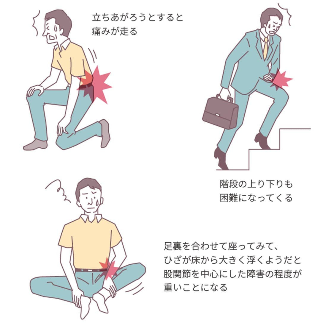 そのほか、変形性股関節症はある程度、セルフチェックで見当をつけることができます。