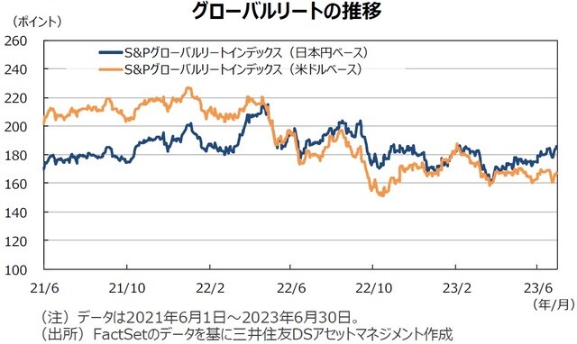グローバルリート市場(米ドルベース)は、米国のソフトランディング期待が高まり、投資家のリスク選好姿勢が強まったことから、上昇しました。米国リート市場は、FRBが政策金利の見通しを年内にあと2回の利上げを見込む水準に修正したことなどから長期金利が上昇したものの、堅調な米国景気を示す経済指標を受けて反発しました。一方、英国やアジアのリート市場は長期金利の上昇を受けて軟調に推移しました。日本リート市場も小幅に下落しました。S&Pグローバルリート指数(米ドルベース)のリターンは前月末比+2.6%となりました。また、為替効果がプラスに寄与し、円ベースのリターンは同+6.1%となりました。