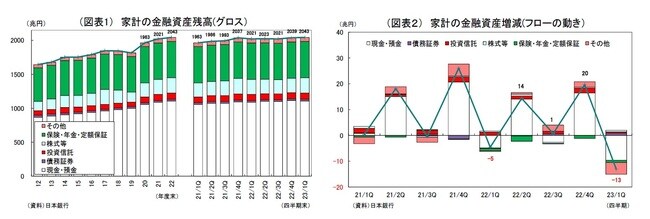2023年3月末の個人金融資産残高は、前年比21兆円増(1.1%増)の2043兆円となった。過去最高であった昨年末の水準を上回り、2四半期連続で過去最高を更新した1。