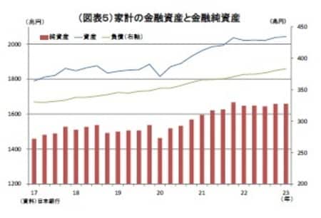 なお、家計の金融資産は、既述のとおり1-3月期に4兆円増加したが、この間に金融負債が3兆円増加したため、金融資産から負債を控除した純資産残高は12月末比1兆円増の1660兆円となった(図表5)。