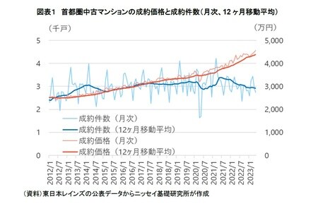 マンションの平均価格や売れ行きを月次で見ると、その数値を構成する物件の立地やグレードによりぶれが大きくなる。そこで成約価格と成約件数それぞれを直近12ヶ月の移動平均に変換してみると、2023年5月の価格は4,383万円(前年同月比+8.9%)と前年比で強い上昇傾向である一方で、件数は2,925戸(前年同月比▲5.3%)と減少傾向である(図表1)。