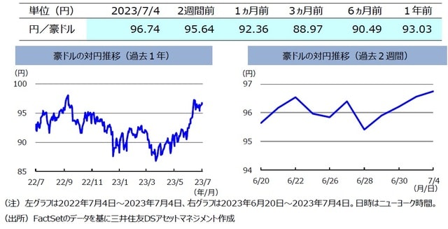 ここ2週間の豪ドルの対円レートは、上昇しました。7月4日、豪州準備銀行(RBA)は金融政策決定会合で政策金利を据え置きました。前回会合では、2ヵ月連続で利上げを実施し、さらなる利上げを示唆していましたが、6月28日に発表された豪州の5月の消費者物価指数(CPI)は前月比▲0.4%とインフレが減速したことなどにより、7月は政策金利が据え置かれました。ただしRBAの声明文では、豪州のインフレ率は依然として高く、労働市場も引き続き引き締まった状態にあることから、今後も物価と賃金の上昇が再加速するリスクを警戒している旨が示されました。また期間中、米国では追加利上げ期待が高まったことで米ドル高・円安が進行しました。これらを背景に、豪ドルの対円レートは上昇しました。