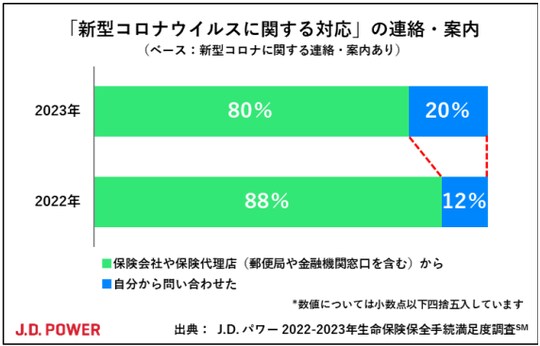 これまではそのうちの9割程度が保険会社や保険代理店からの受動的な連絡案内であったが、2023年調査では、顧客自らが問い合わせをする割合が前年に比べ+8ポイント増加し20%となった。