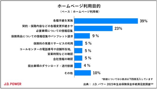 保全期間中に保険会社のホームページを閲覧/利用した顧客は年々増加しており、2023年調査では48%の顧客が利用していた。利用の目的としては、「各種手続きを実施」が39%、「契約・保障内容などの各種変更手続きや必要書類についての情報収集」が23%と、2022年から大きな変化はみられなかった。