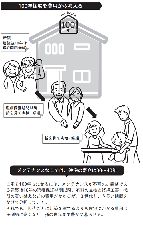 住宅を100年もたせるには、メンテナンスが不可欠です。義務である建築後10年の瑕疵保証期間以降、有料の点検と修繕費用・機器の買い替えなどの費用がかかります。それを3世代という長い期間をかけて分担していきます([図表1]参照)。