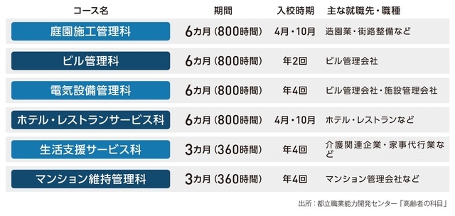 例えば、下記の[図表1]は、東京都内の公共職業訓練校である「都立職業能力開発センター」が実施する、概ね50歳以上の人を対象とした職業訓練コースの科目一覧です。