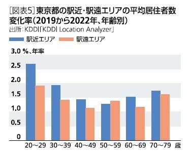 また、年齢別に見ると、50代を除き、駅近エリアの居住者数の増加率が駅遠エリアより高く、特に20代から30代の若年層ではこの傾向が顕著である[図5]。