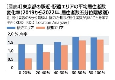具体的には、携帯位置情報データであるKDDI「KDDI Location Analyzer」を使用して、各駅を居住者数の5分位階級に分け、2019年から2022年にかけての平均居住者数変化率を、駅近エリアと駅遠エリアで比較した[図表4]。