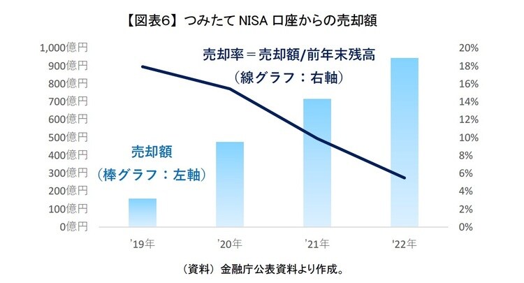 つみたてNISA口座からの売却額(棒グラフ)は年々、増加しており2022年は945億売却されたが、これはあくまでも買付額や残高が急激に増加しているためである【図表6】。