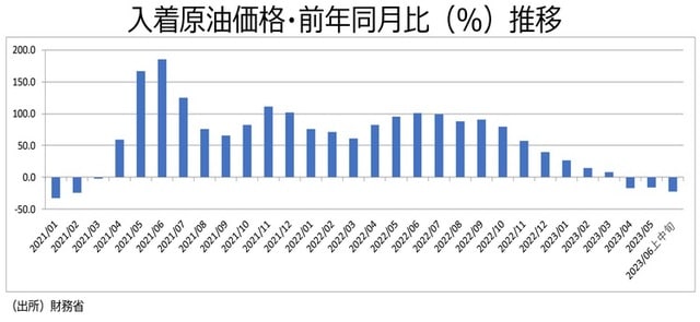 ~23年4月、25ヵ月ぶりに下落へ転じた「入着原油価格・前年同月比」。23年6月まで〈3ヵ月連続下落〉の可能性大