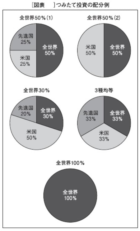 もう一つあるとすれば、「全世界」の割合は先ほど5割としていましたが、これを3割として、残った7割のうち5割を「米国」、2割を「先進国」という配分にする案も考えられます。「全世界」が全体に占める割合については、5割だと比較的無難な取り方となり、3割だと自分の考えを多く取り入れることになってくると考えるとわかりやすいでしょう。