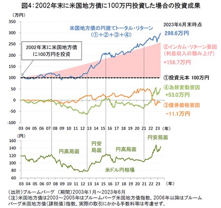 2002年末以降の米国地方債への円建て投資成果を振り返ると、インカム収入の積み上げが長期的なトータル・リターンの基調を決定する主要因となってきました(図4)。