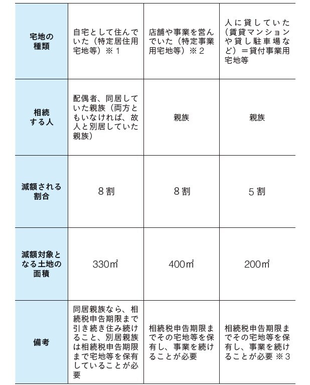 「特定居住用宅地等」(上限330㎡)や「特定事業用宅地等」(上限400㎡)の場合は土地の評価額が8割、「貸付事業用宅地等」(上限200㎡)は5割が減額されます。