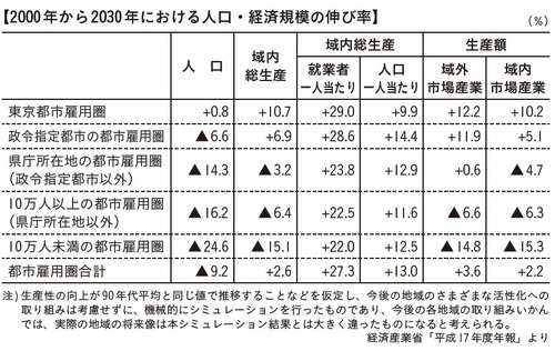 経済産業省の報告によると、2030年に向けて人口規模の大きな都市ほど人口の伸び率や経済成長力が高いとなっています。そして「政令指定都市の都市雇用圏」→「県庁所在地の都市雇用圏」→「10万人以上の都市雇用圏」→「10万人未満の都市雇用圏」の順で、下位にいくほど人口減少の割合が大きくなるという結果が公表されました(図表1)。