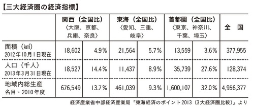 [図表2] 三大圏(関西・東海・首都圏)の面積、人口、地域内総生産の比較