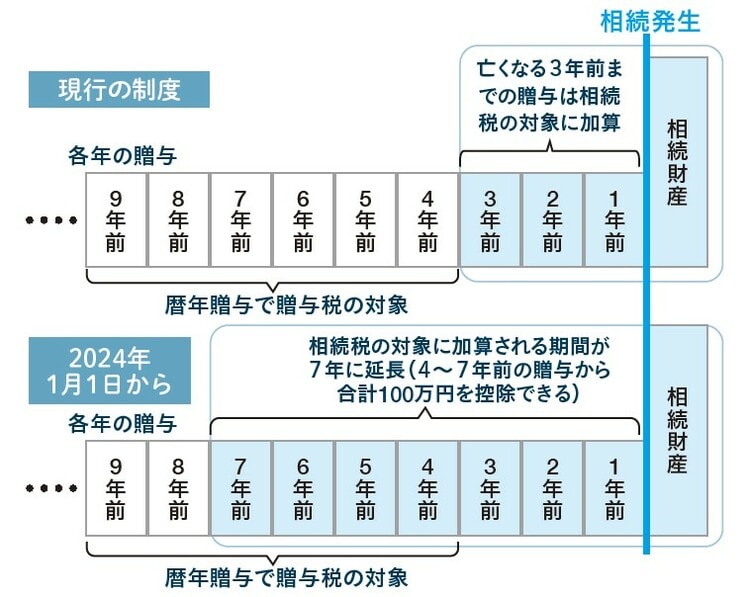 これまで「相続開始前3年以内」に行われた生前贈与は相続財産に加算されましたが、今回の改正で「7年以内」に延長。従来よりも早めの検討が必要になりました([図表1]参照)。