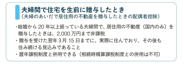 婚姻期間が20年以上続いた夫婦のあいだで、居住用の不動産や住宅取得資金の生前贈与をする場合は2,000万円まで贈与税がかかりません。暦年課税制度とも併用できます([図表3]参照)。