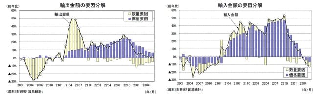 輸出の内訳を数量、価格に分けてみると、輸出数量が前年比▲4.8%(5月:同▲6.4%)、輸出価格が前年比6.7%(5月:同7.4%)、輸入の内訳は、輸入数量が前年比▲6.1%(5月:同▲5.1%)、輸入価格が前年比▲7.3%(5月:同▲4.9%)であった。