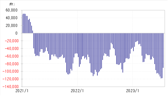 CFTC(米商品先物取引委員会)統計の投機筋の円ポジションは、足元で9万枚を売り越しています。