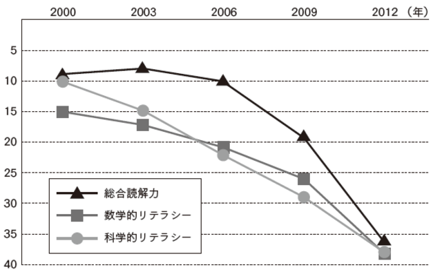 下記の図表は、OECDによる生徒の学習到達度調査(Programme for International StudentAssessment:通称PISA)の結果だ。子供の総合読解力、数学的リテラシー、科学的リテラシーの3項目を国際的に比較したものだ(国際順位)。