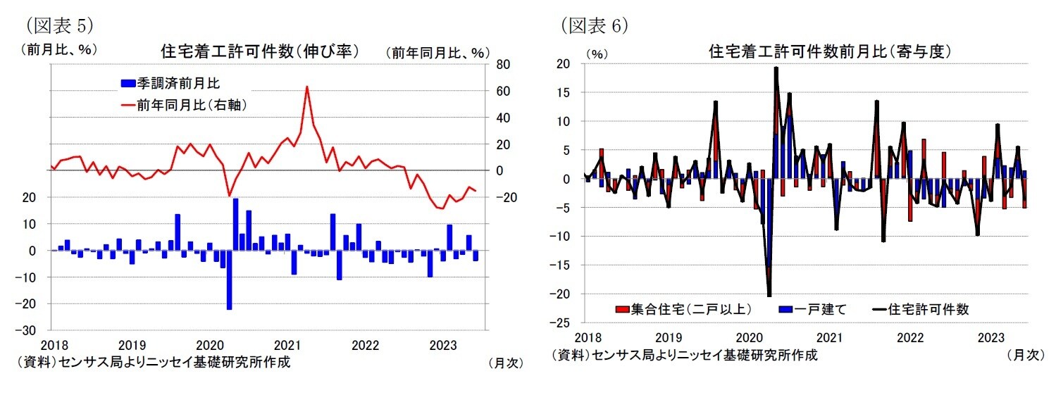 着工許可件数(季節調整済、年率)は144.0万件(前月改定値:149.6万件)と149.1万件から小幅上方修正された前月、市場予想の150.0万件を下回った(図表2、図表5)。