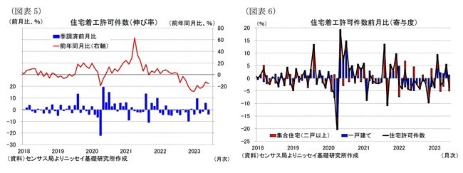 戸建てが▲7.0%(前月:+18.7%)と20年6月以来の伸びとなった前月からマイナスに転じたほか、集合住宅も▲9.9%(前月:+10.6%)と21年3月以来の伸びとなった前月からマイナスに転じた(図表4)。