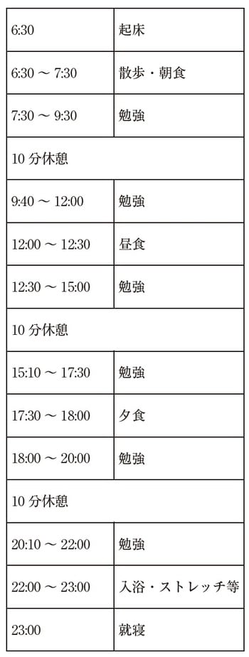 いかがでしょうか。1日13時間勉強していますが、睡眠時間は7時間半です。睡眠時間を十分確保しながらでも、勉強時間は増やせることがわかります。