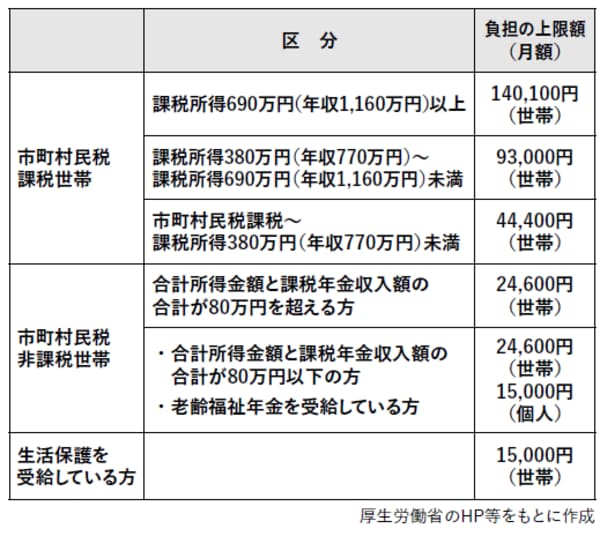 しかも、収入の低い人の自己負担はさらに安くなり、65歳以上の世帯で全員が市区町村税を課されていなければ、支払いの上限は月2万4,600円。さらに、前年の合計所得と公的年金を合わせて年間80万円以下の方(個人)なら、月1万5,000円です。