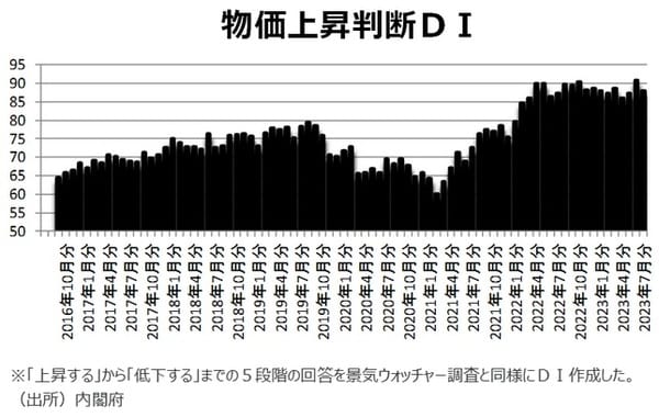 ロシアのウクライナ侵攻による世界的なエネルギーや穀物価格の上昇が意識された22年3月から23年7月の17ヵ月間では、物価上昇判断DIは86~91の高水準で推移し、その期間の平均は88と全調査期間の平均の75を上回っています。23年7月は88で6月の91からやや鈍化しました。